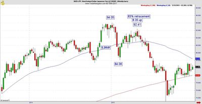 FOREX weekly chart NZ-JPY has low of 84.06 then move of 8.35 up is an 83% retracement to top AND excellent example of replication flip leads to move of the year!